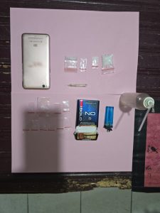 Tim menemukan YA (26 tahun) yang sedang memegang bong beserta barang bukti lainnya berupa 4 paket narkotika jenis sabu, 1 buah kaca pirek, 1 buah alat hisap bong, 1 buah mancis, 1 unit smartphone warna putih emas, 10 plastik klip kecil bening, dan 1 buah kotak rokok on bold.