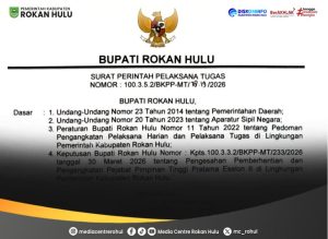 Bupati secara resmi menunjuk dan mempercayakan amanah Pelaksana Tugas (Plt) Sekda kepada Drs. H. Yusmar, M.Si. Penunjukan ini tertuang dalam Surat Keputusan Bupati Rohul Nomor: 100.3.5.2/BKPP-MT/78.19/2026 yang ditandatangani pada Kamis malam (2/4/2026) pukul 22.00 WIB.